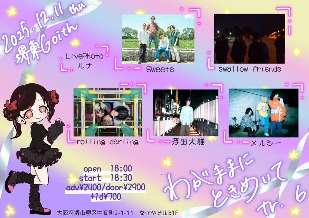 わがままにときめいて track6 2025 11/15 2025年12月11日(木)堺東GoithOPEN/START 18:00/18:30 チケット 前売り/当日 2,400円/2,900円 出演アーティスト swallow friends/rolling darling/浮田大雅/メルシー YOKOE WHEEL 2025 in JACKLION